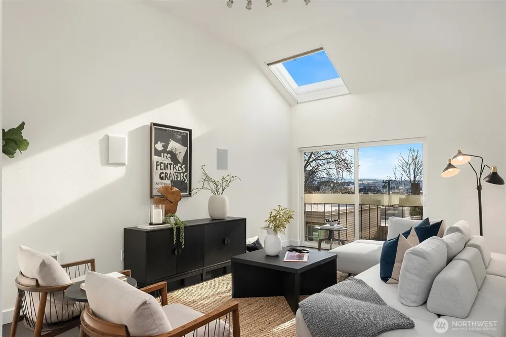 Enjoy stunning views of the Space Needle and Puget Sound from the living room of this end-unit condo in Queen Anne. Positioned away from street traffic and just blocks from Climate Pledge Arena, Seattle Center, dining, and shops, this location offers convenient access to some of Seattle’s best amenities. Quick access to Hwy 99 and I-5 makes commuting easy. Features include quartz counters, high-gloss cabinetry, Bosch appliances, wood floors, vaulted ceilings, recessed dimmable lighting, and multiple skylights, including one in the bathroom. Includes a dedicated garage space, carport, and plenty of storage.