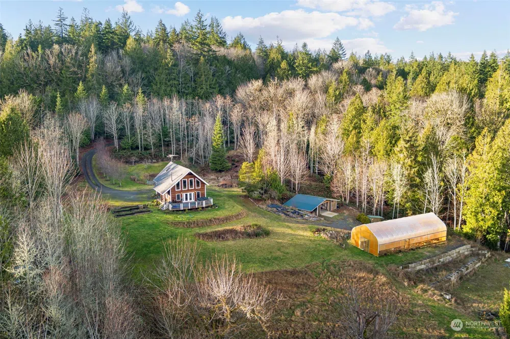 Discover the perfect oasis where serene living meets urban convenience. Set on a sunny 4.9 acres, this stunning property welcomes you with expansive skies and breathtaking sunrises over the treetops of Chimacum Valley. Enter to the living room with a vaulted ceiling, cozy wood stove and elegant French doors that frame beautiful views. The property boasts a high-tunnel greenhouse, a chicken coop, a workshop, a storage shed, and an advanced water filtration system, ensuring your country lifestyle is both comfortable and sustainable. Experience the charm of the Quilcene community and savor the offerings of Chimacum’s local farm stand, cideries, and restaurants with the historic Victorian seaport of Port Townsend just minutes away.